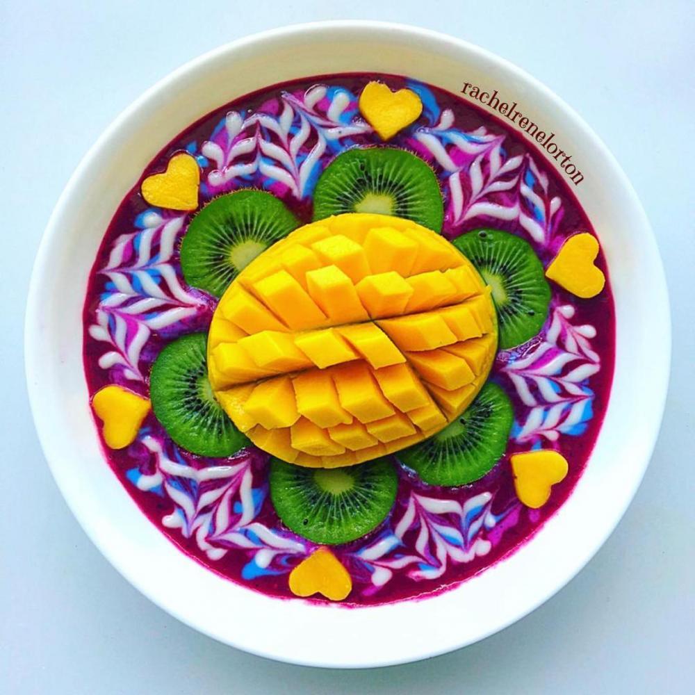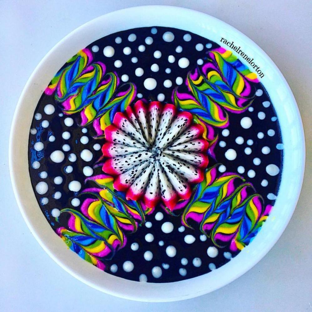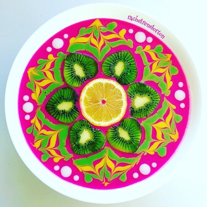 Smoothie; veganların, sağlıklı beslenmeye ve fit kalmaya özen gösterenlerin favori içeceklerinden. Tatlı krizlerini sağlıklı bir şekilde atlatmak için tatlı niyetine veya diyetlerde ara öğün niyetine tüketilebiliyor. Çiğ beslenme (raw food) akımının da önemli bir parçası olan bu içecekler; tahıl, kuruyemiş, meyve, sebze, yoğurt – vegan versiyonlarda hindistan cevizi yoğurdu, badem sütü, fındık sütü gibi alternatifler kullanılıyor- ve benzeri zengin malzemelerle yapılıyor. Bu nedenle adeta birer vitamin deposu olarak nitelendiriliyorlar. Rachel Lorton, bu harika içecek türünü mandala ve ebru karışımı saykodelik desenlerle süsleyerek görsel açıdan geliştirmiş. Üstelik eli de bu konuda oldukça hızlı. Bir tabağı dekore etmek yalnızca 3-4 dakikasını alıyor.