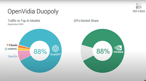 - Galloway’e göre Nvidia, AI ekosisteminin gerçek kazananı olabilir. OpenAI gibi şirketler, ne kadar büyük olursa olsun, Nvidia’nın çiplerine bağımlı kalmaya devam edecek. Bu nedenle, gelecekte AI dünyasının patronu donanımı kontrol eden Nvidia olabilir. Eğer AI alanındaki trendler devam ederse, Nvidia’nın Tesla’dan çok daha büyük bir pazar payına sahip olmasını bekliyor.