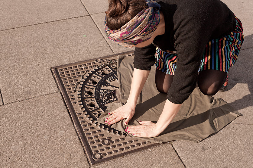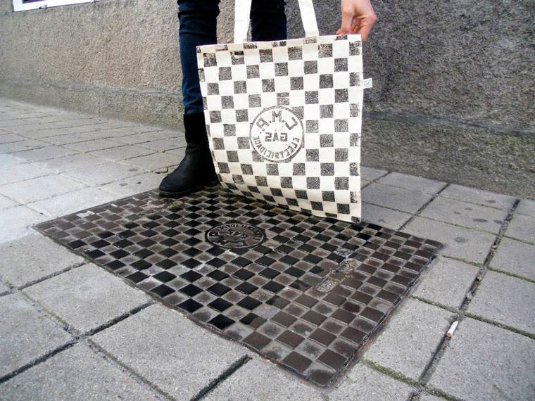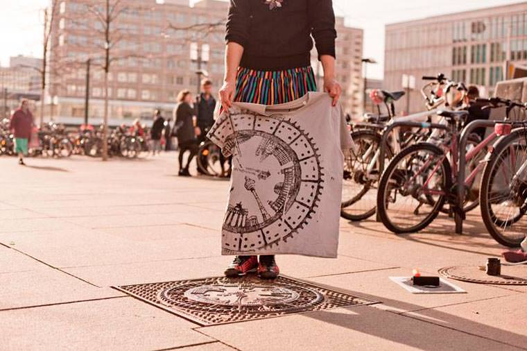 Berlin merkezli Raubdruckerin (Pirate Printer), sokaklarda dolaşırken dikkatimizi bile çekmeden her gün üzerine basıp geçtiğimiz rögar kapaklarını ve mazgal gibi demirbaşları baskı malzemesi olarak kullanan bir sanatçı kolektifi. Raubdruckerin’deki sanatçılar tişörtlere, kapüşonlulara ve bez çantalara su kanallarına inen kapakların, mazgalların desenlerini yalnızca mürekkep ve kağıt kullanarak basıyor.