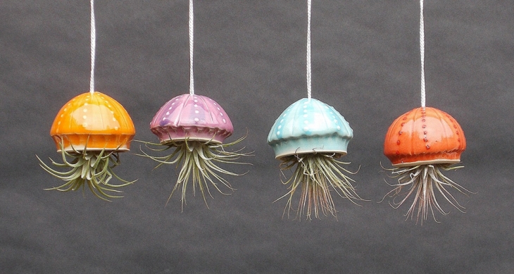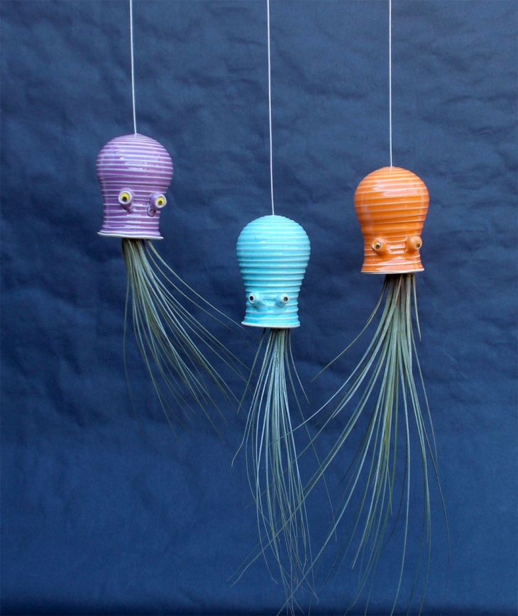 Etsy sanatçılarından olan Kaliforniyalı Cindy ve James Searles, el emeği göz nuru rengarenk seramiklerini, “Airplant” diye bilinen topraksız bitkilerle birleştirmiş ve ortaya ahtapot, deniz anası, mürekkep balığı formlarında harika saksılar çıkmış.
