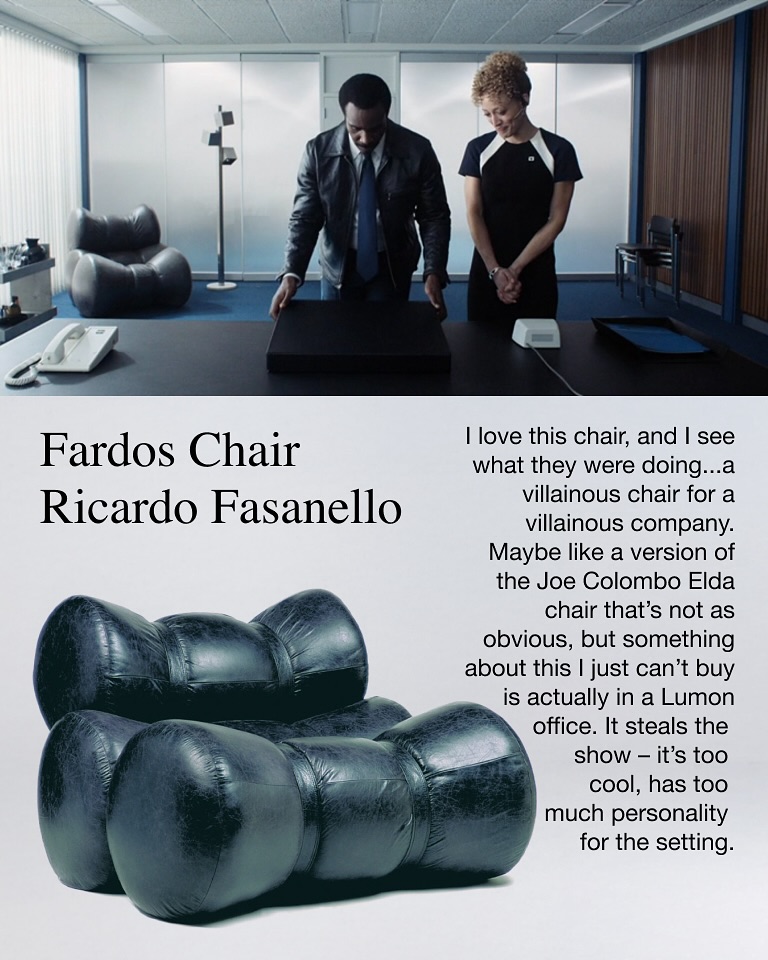 Ricardo Fasanello tarafından 1968 yılında tasarlanan Fardos Lounge Chair hakkında Isabelle Angèle şöyle diyor: “Bu sandalyeyi seviyorum ve ne yaptıklarını görüyorum… kötü bir şirket için kötü bir sandalye. Belki Joe Colombo Elda sandalyesinin o kadar belirgin olmayan bir versiyonu gibi, ama aslında bunun bir Lumon ofisinde olmasıyla ilgili ikna olmadığım bir şey var; gösteriyi çalıyor, çok havalı, ortam için çok fazla kişiliğe sahip.”