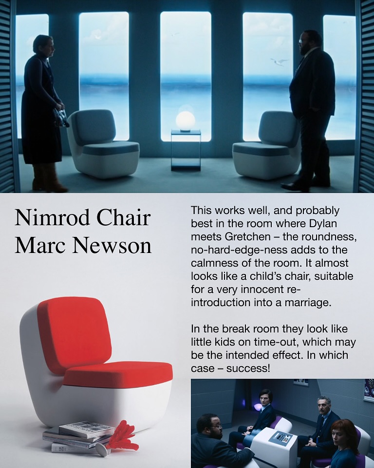 Nimrod Chair, 2009 yılında İtalyan marka Magis için Marc Newson tarafından tasarlandı. Isabelle Angèle bu tasarımın Severance’ta kullanılmasını şöyle yorumluyor: “Bu iyi çalışıyor ve muhtemelen Dylan’ın Gretchen ile tanıştığı odada en iyi şekilde işliyor – yuvarlaklık, sert olmayan kenarlar odanın sakinliğine katkıda bulunuyor. Neredeyse bir çocuk sandalyesi gibi görünüyor, bir evliliğe çok masum bir şekilde yeniden giriş için uygun. Mola odasında, mola veren küçük çocuklar gibi görünüyorlar, bu amaçlanan etki olabilir. Başarılı!”