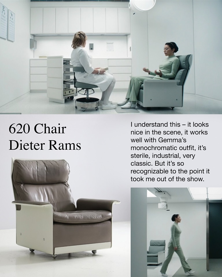 Alman tasarımcı Dieter Rams’ın imzasını taşıyan 620 Chair Programme; 1962’den beri Vitsœ tarafından el yapımı olarak üretiliyor. Birden fazla koltuk yan yana getirilip birleştirildiğinde, kanepeye dönüşebiliyor. Dieter Rams’ın minimalist tasarımlarına, dizinin son sezonunda bolca yer verilmiş.