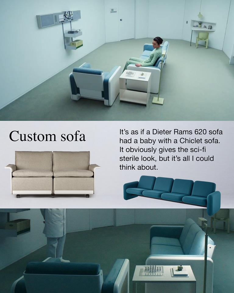 Minik bir parantez açayım, halk arasında “Chiclet” olarak bilinen Wilkes Modular Sofa Group adlı kanepe, 70’lerde Ray Wilkes tarafından Herman Miller için tasarlanmıştı. Angèle, dizide kullanılan mavi kanepeyi, Ray Wilkes ile Dieter Rams kanepelerinin karışımı gibi görüyor.