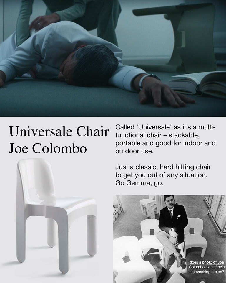 Ancak Isabelle Angèle bu tasarımın Severance’ta kullanılmasından pek de memnun değil: “Bunu anlıyorum – bu sahnede hoş görünüyor, Gemma’nın tek renkli kıyafetiyle iyi uyum sağlıyor, steril, endüstriyel, çok klasik. Ama beni dizinin gerçekliğinden uzaklaştıracak kadar tanınabilir.”