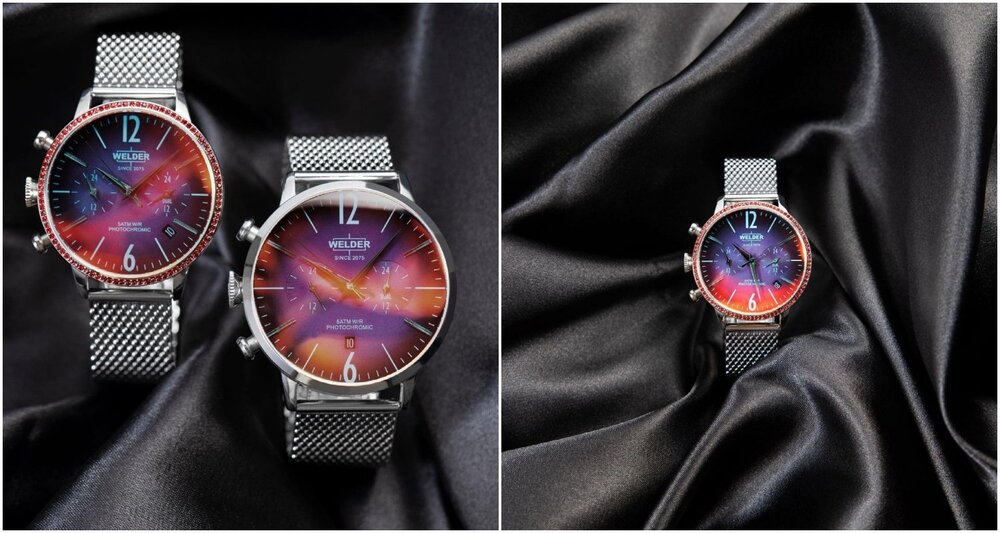 Welder Watch’un fotokromik camlarındaki renk değişimi ışığın şiddeti ve açısına göre belirlendiğinden yan yana duran iki Moody modeli kendine has havasını ve özgünlüğünü de koruyor. Kadın Moody modelinde çelik kasa ve kırmızı gövde, kırmızı taşlarla zenginleşerek şık ve gösterişli bir havaya giriyor.