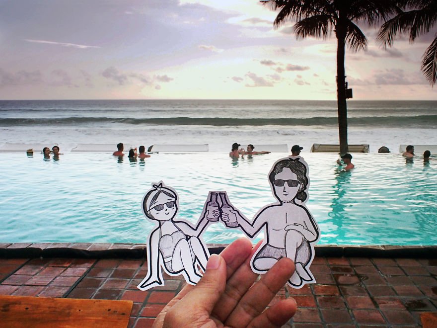 Selfie akımının dışında kalmayı tercih eden Endonezyalı çift Andreas ve Felicia Hutabarat, seyahat anılarını kaydetmek için yaratıcı ve pratik bir yöntem geliştirmiş. Felicia çizmeyi, Andreas ise fotoğraf çekmeyi çok sevdiğinden Doodledeux adını verdikleri Instagram projesiyle hem yeteneklerini konuşturmuşlar hem de seyahatlerini kayıt altına almışlar.