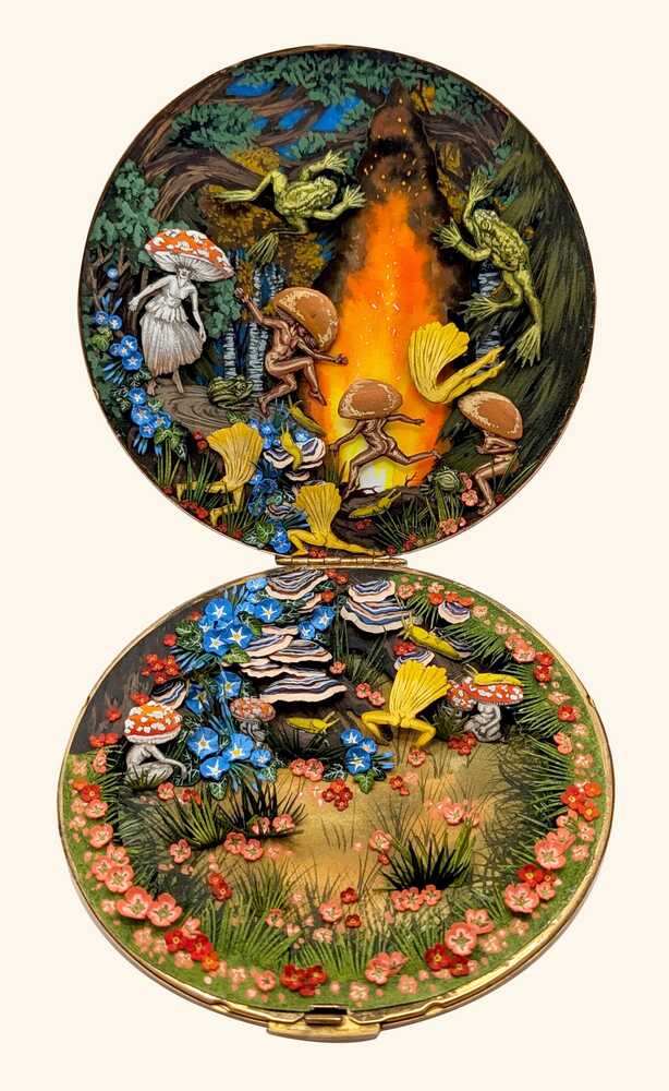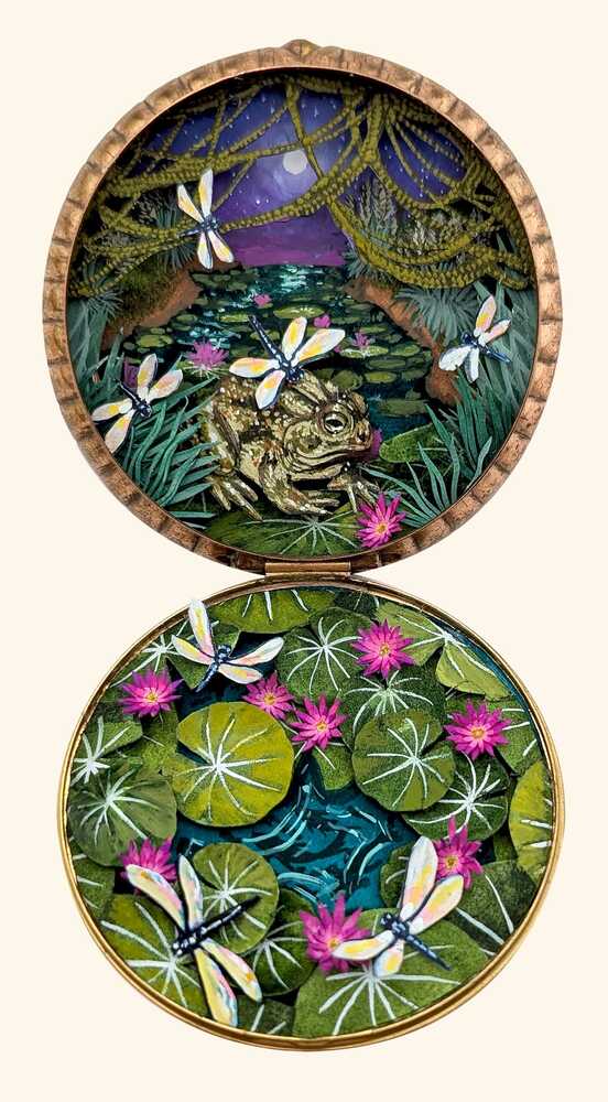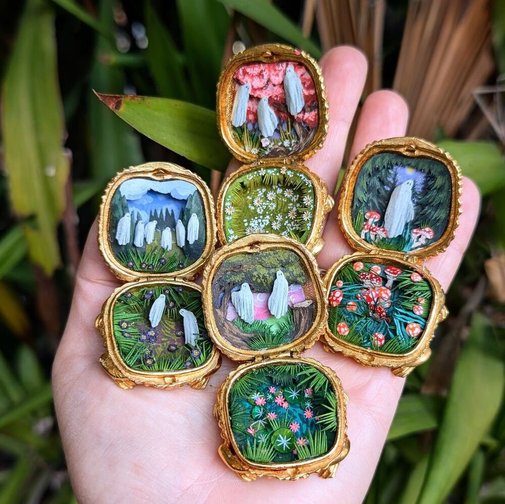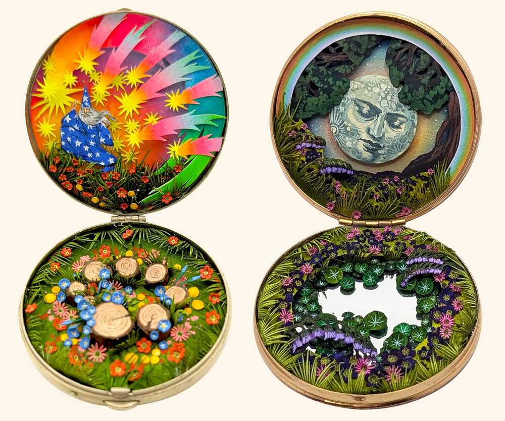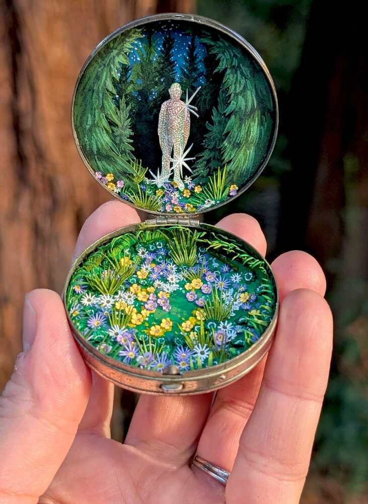 Shannon Taylor, cep aynası boyutundaki vintage kutuların içine, özenle hazırladığı büyülü dünyalar inşa ediyor. Oakland merkezli sanatçı bu antika kapları; fantastik yaratıklar, perili ormanlar, çiçekler, mantarlar, ağaçlar ve gizemli doğa manzaralarıyla dolu ekosistemlere dönüştürüyor.