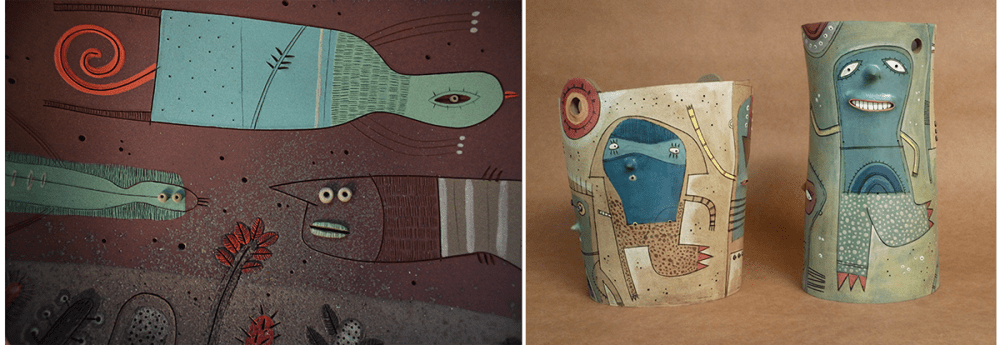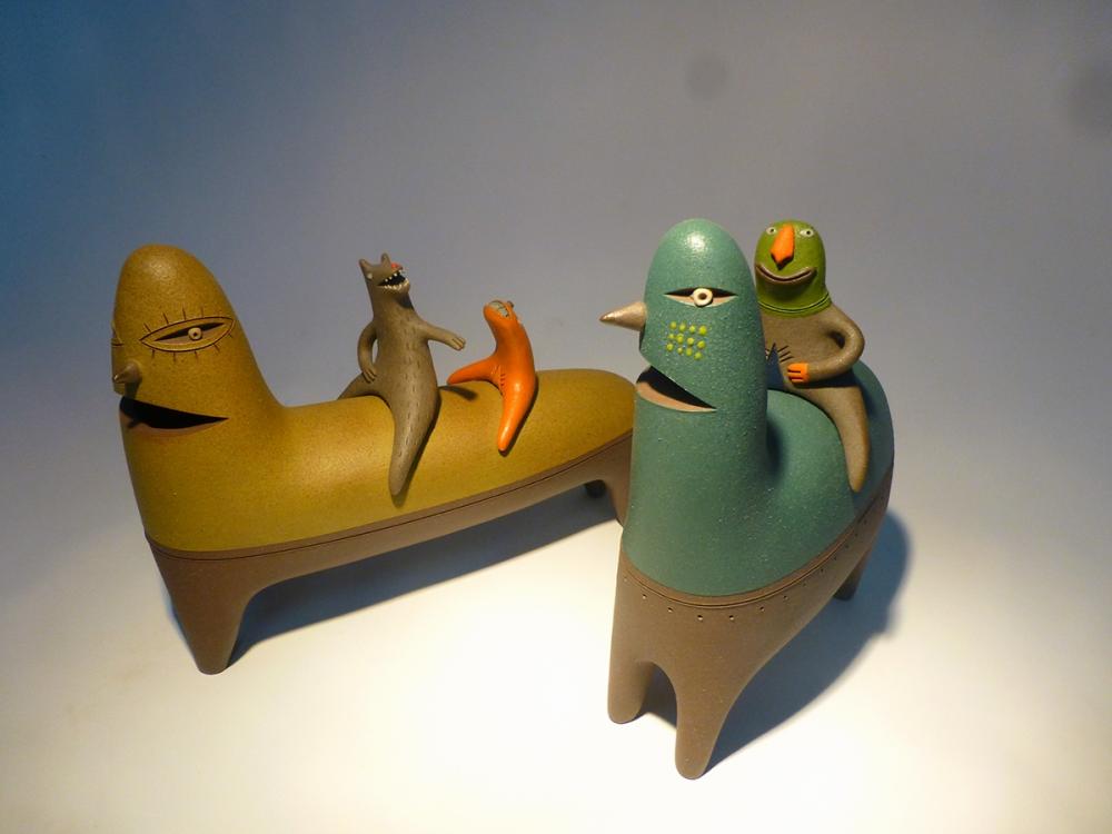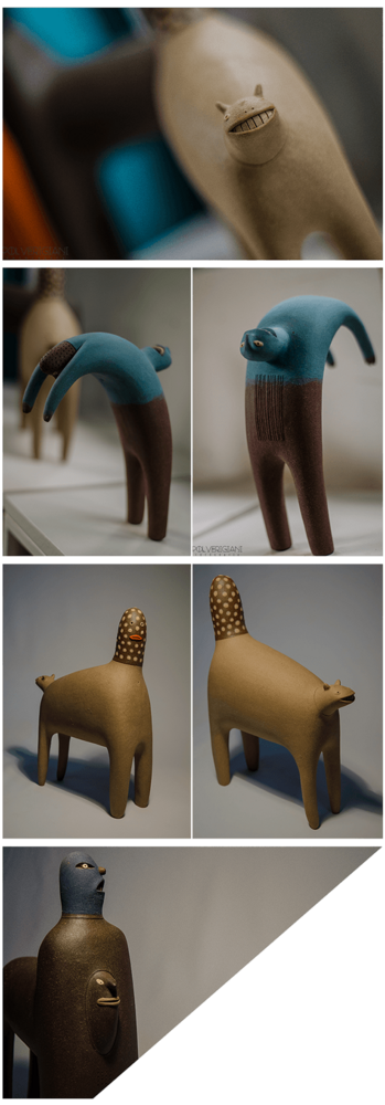 İllüstrasyonlarda görmeye alıştığımız, yer yer folklorik öğeler içeren bir parça da Picasso’nun kübist karakterlerini anımsatan heykeller, seramiğin kendine has dokusuyla hayat bulmuş ve ortaya çok özgün çalışmalar çıkmış. Polverigiani’nin gaz fırınında 1180°C sıcaklıkta fırınladığı parçalar, bu sıcaklığa bağlı olarak vitrifiye oluyor, başka bir deyişle seramik hamurunun camlaşmasıyla birlikte estetik bir doku kazanıyor.