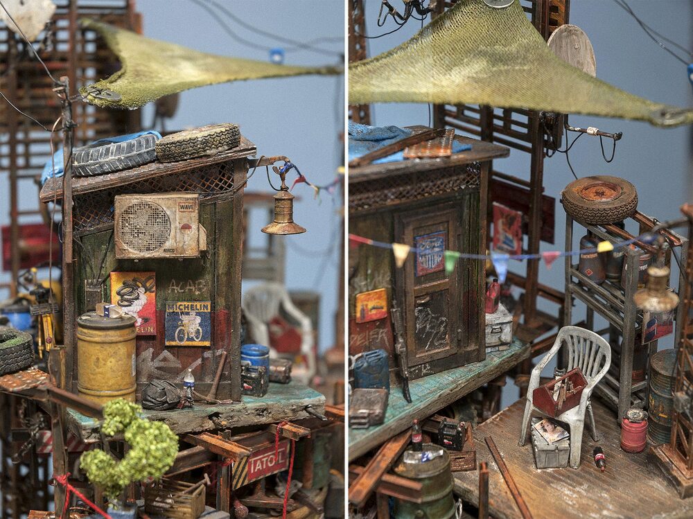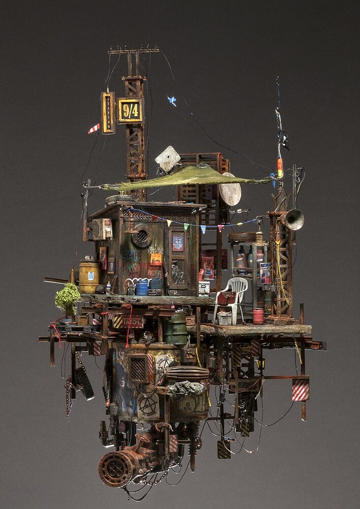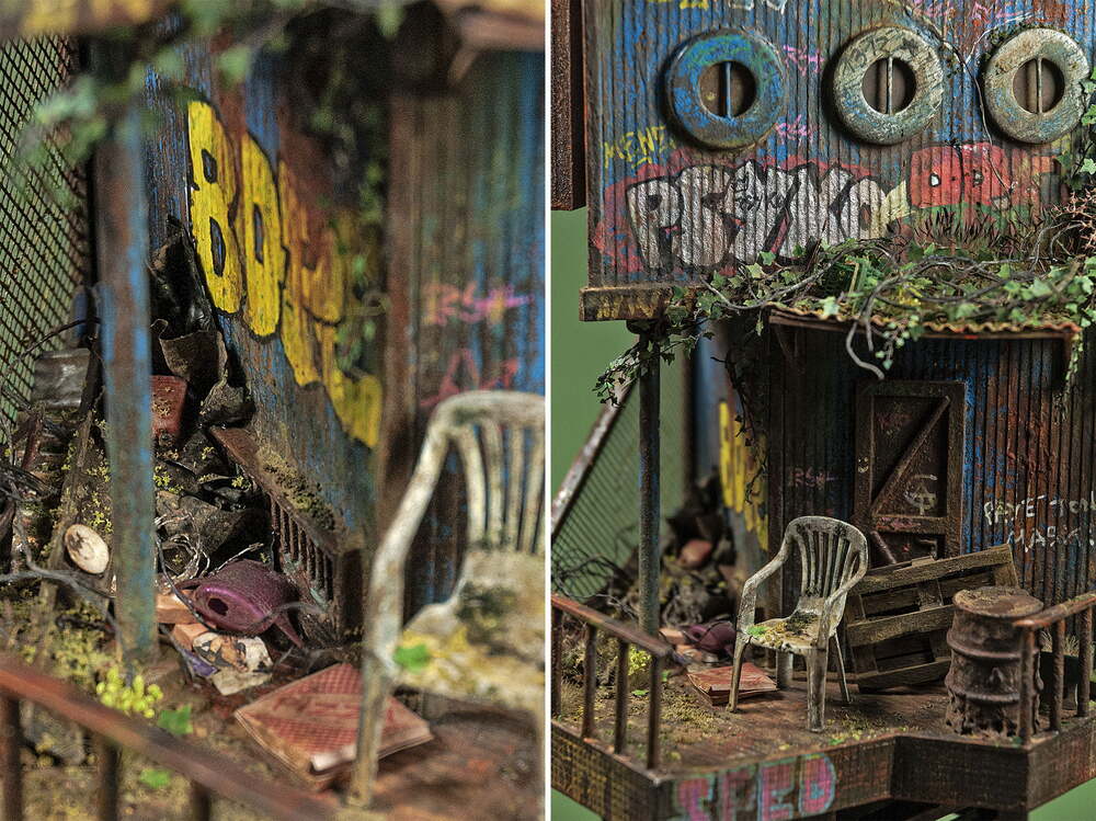 Çürüyen yapılarla bezeli dioramalar artık terk edilmiş alternatif bir dünyayı gözler önüne seriyor. Her biri insanlığın yıkıcı niteliklerini sergilerken, en nihayetinde doğanın baskın çıkma gücünü gösterir. Açıkçası çalışmaları ilk gördüğümde Miyazaki’nin “Modern hayatın çökmesini ve her yeri yabani otların kaplamasını sabırsızlıkla bekliyorum.” sözü aklıma gelmişti.