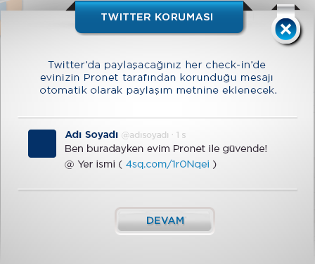 Siz evde değilken sosyal medyada sizi koruyan proje, “Hırsız Savar ile check-in yapın, bırakın hırsızlar sizden çekinsin.” mesajıyla güvenle check-in yapmanızı sağlıyor. Siteye Fourquare veya Swarm hesaplarınızla giriş yapıyorsunuz. Böylece yaptığınız her check-in’e evinizin de Pronet tarafından korunduğunu belirten bir ibare ekleniyor.