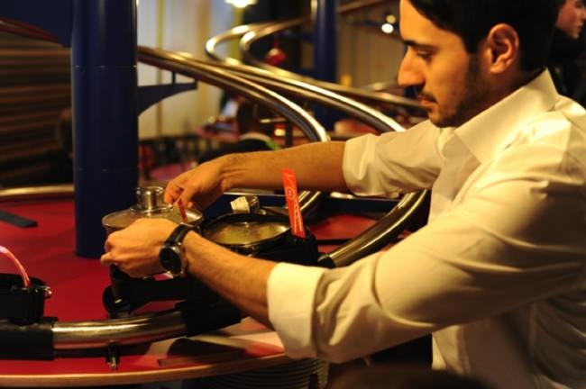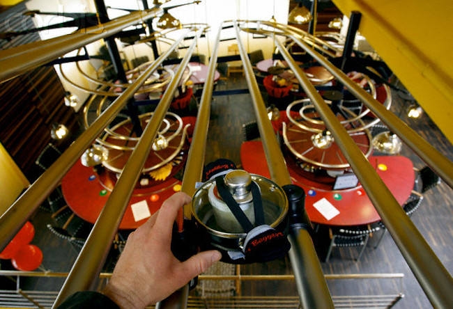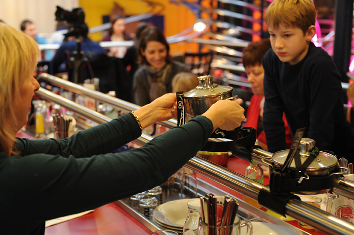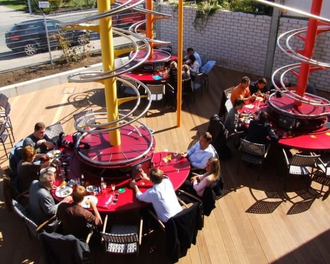 Garsonsuz hizmet veren restoranda siparişinizi masanızda bulunan dokunmatik ekranları kullanarak veriyorsunuz ve birkaç dakika içinde hazırlanan yemeğiniz minik bir tencere içinde yukarıdaki mutfaktan aşağıya metal raylar üzerinde döne döne seyahat ederek masanıza ulaşıyor.