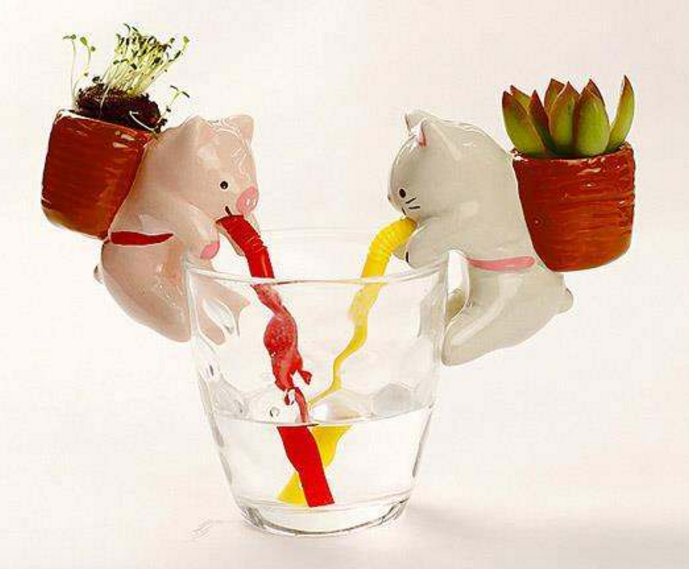 Panda, domuz, kedi, tavşan gibi sevimli porselen hayvancıkları içi su dolu bir bardağın kenarına dışardan ya da içerden takıyorsunuz. (iki türlü de çok şeker bir ifadeleri oluyor!) Sırtlarındaki sepetlerinin içine gizlenmiş pipetin diğer ucu hayvancığın ağzından bardağa uzanıyor ve ihtiyacı oldukça su almasını sağlıyor.
