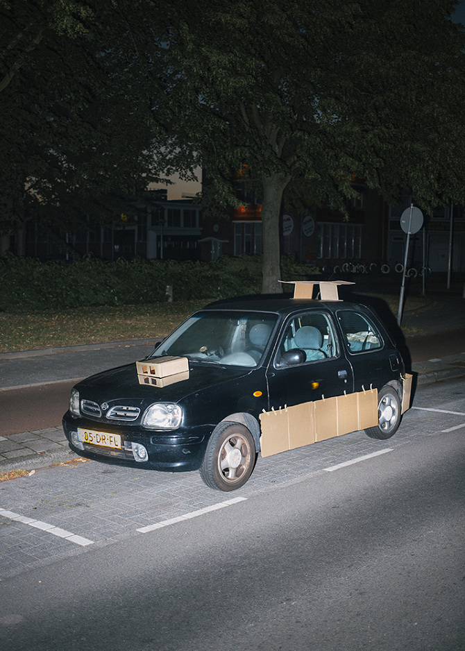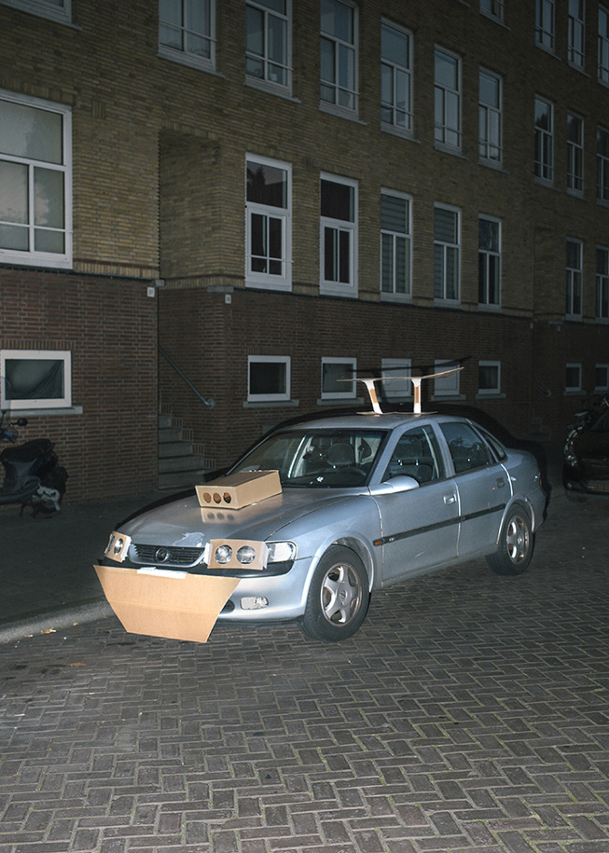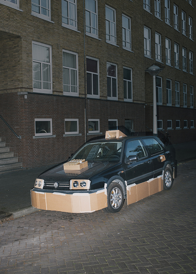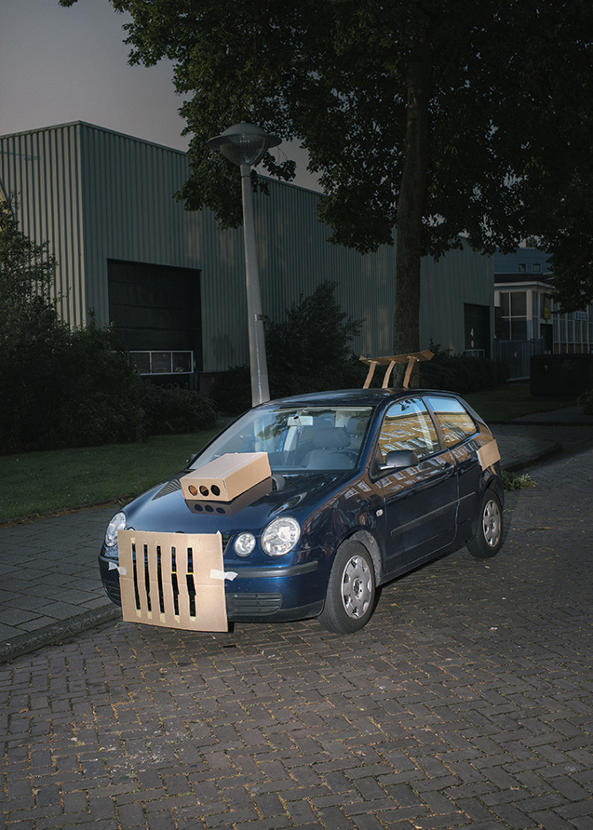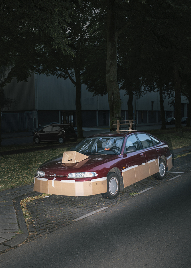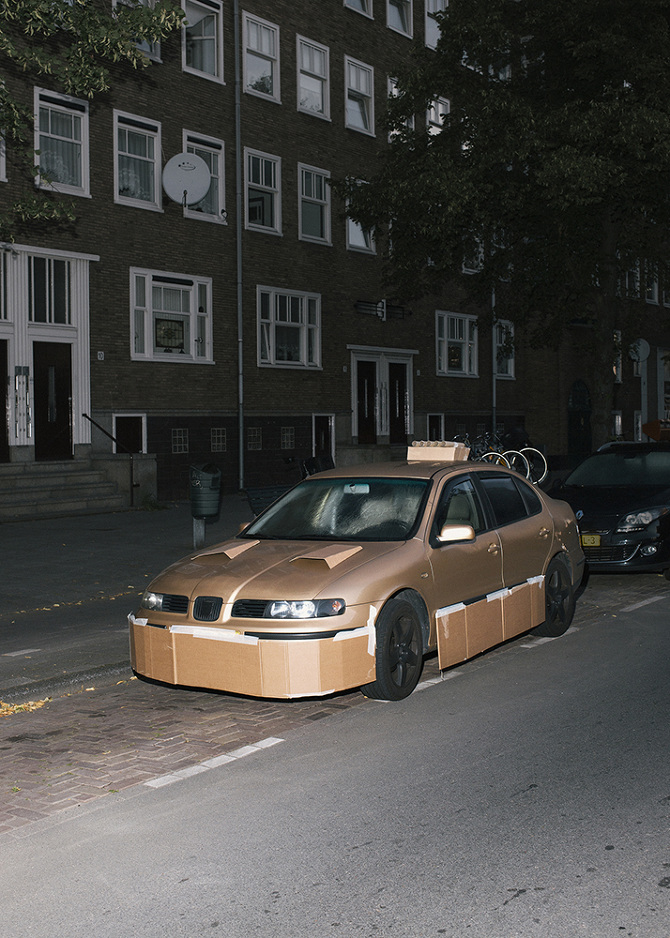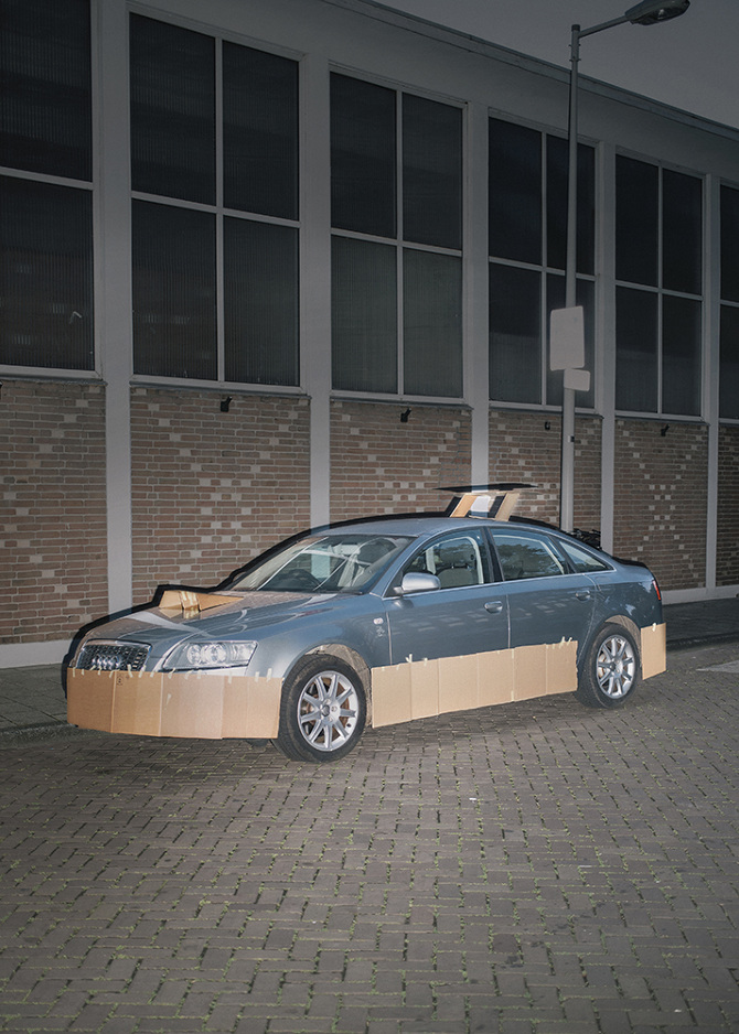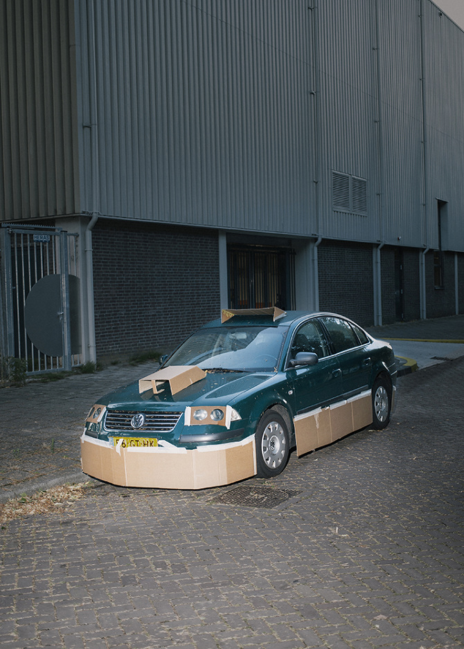 Rüzgarlık, motor kapağı havalandırması, tampon gibi parçaları kartondan, biraz eğreti biraz absürd bir tonla fotoğraflıyor. Bir nevi süper araçlara dönüşen sıradan otomobillerle proje otomobil tasarımlarının ve dışavurumunun tekdüzeleşmesine eğlenceli bir vurgu yapıyor.