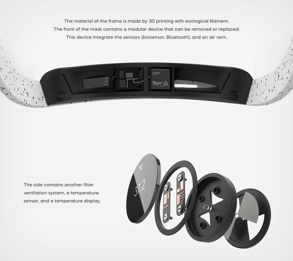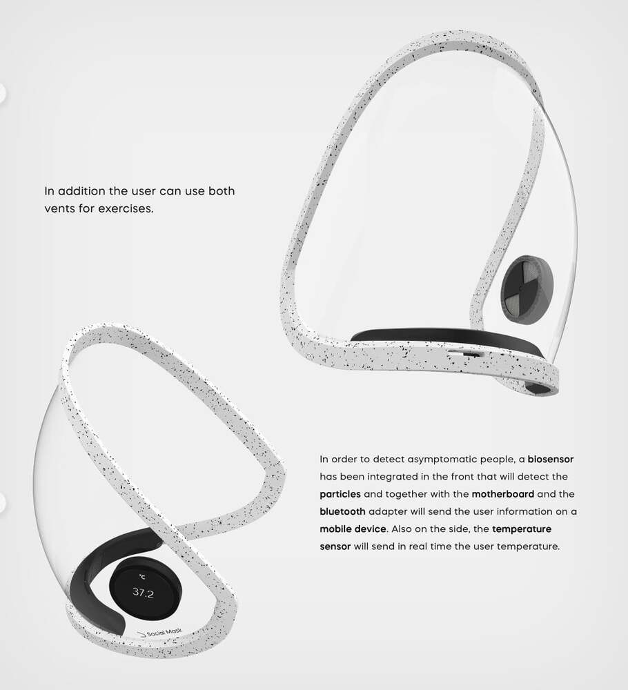 Romanyalı ürün tasarımcısı Burzo Ciprian’ın imzasını taşıyan maske, veri şeffaflığını esas alıyor ve bu konseptle uyumlu şeffaf bir tasarıma sahip. Kullanıcının soluduğu havayı aktif olarak izleyen bir biyosensör ile birlikte filtreleri de içine alan 3B baskı bir çerçevesi bulunuyor. Maske, hava kalitesi ölçümlerini kullanıcının akıllı telefonuna gönderiyor. Böylece hem tehlikeli virüs ve bakterileri hem de hava kirliliği seviyelerini anlık olarak kullanıcıya raporlamış oluyor.