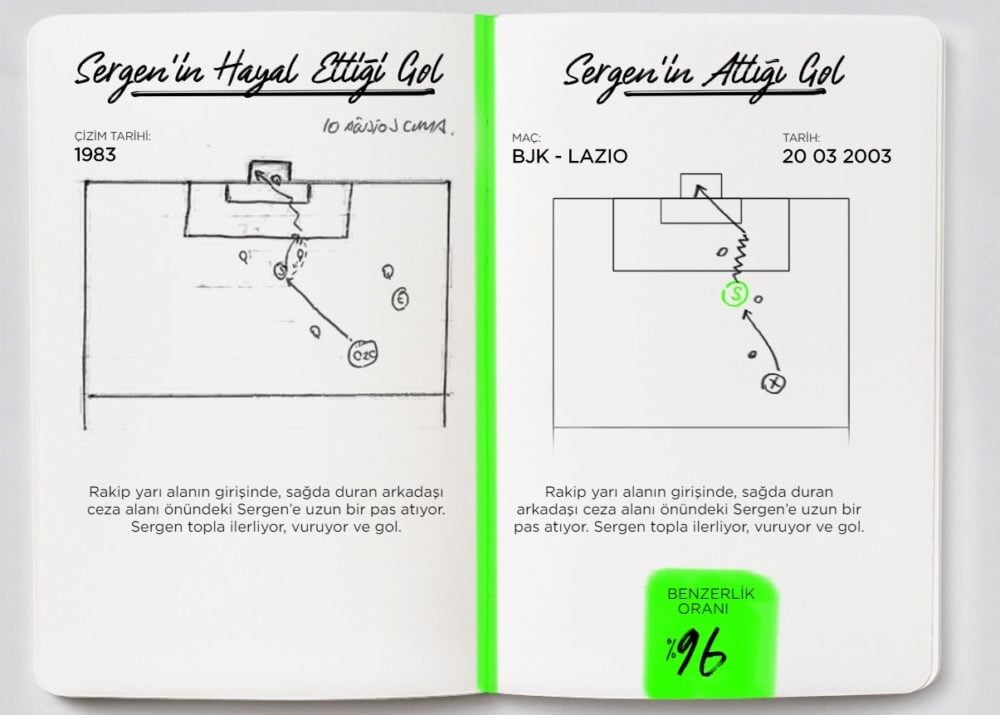 Defterde yer alan 212 gol Sergen Yalçın’ın kariyeri boyunca atmış olduğu 109 gol ile karşılaştırılıyor. Amaç henüz 11 yaşındayken hayal ettiği gollerle, yıllar sonra attığı golleri karşılaştırıp birbirine benzeyen golleri bulmak. Bu amaç doğrultusunda yapay zeka destekli “pattern recognition” programıyla 20 binden fazla işlem gerçekleştirerek karşılaştırma yapılıyor. Yüzde 80 ve daha fazla benzerlik gösteren goller manuel olarak tekrar kontrol ediliyor ve ortaya aranan kriteri sağlayan 32 gol çıkıyor.