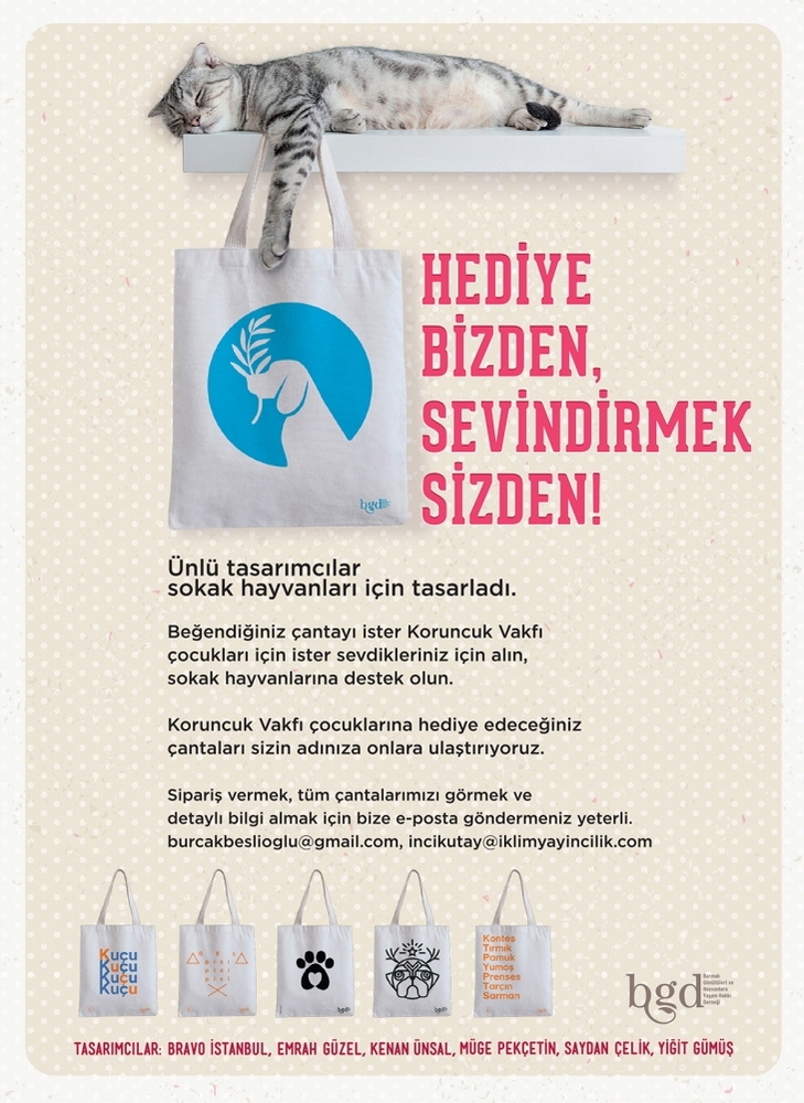Elinden daha fazlası gelen insanlar arasından bir güzel proje çıkıyor. Burçak Beşlioğlu, Barınak Gönüllüleri ve Hayvanlara Yaşam Hakkı Derneği (BGD) ile birlikte bir yılı aşkın bir süredir geliri tamamen sokak hayvanlarına bağışlanan tasarımlar yapıp satılmasını sağlıyor. Projedeki tüm tasarımlar projenin fikir annesinin elinden çıkmıyor. Aksine ünlü ve ödüllü tasarımcılarla iş birliği yaparak onlara revizyon ve müdahaleden uzak özgür tasarım alanı sunuyor.