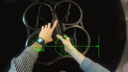 Parrot‘ın geliştirdiği son model olan AR Drone 2 üzerinde çalışan ekip, SmartWatch ile yön bilgisi iletirken SmartEyeglass yardımıyla da drone’un durumu ve kamera görüntüsünü artırılmış gerçeklikle yansıtılıyor.