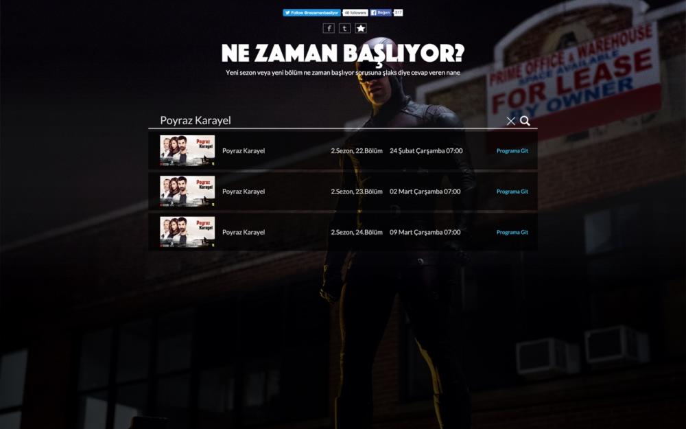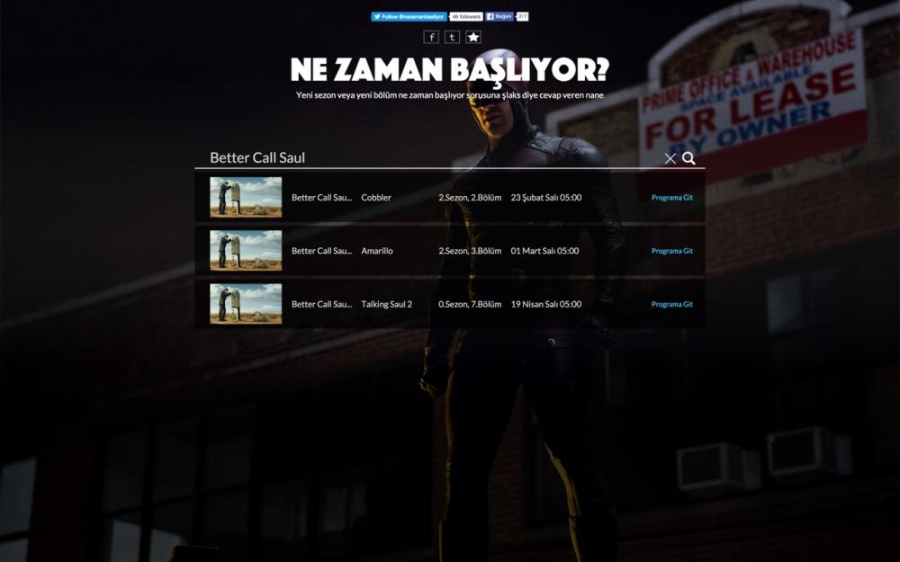 Noluyo.tv‘nin geliştirdiği Ne Zaman Başlıyor? tüm bu muammayı ortadan kaldırıyor ve merak ettiğiniz dizinin başlangıç tarihini tek celsede yanıtlıyor. Bir şey seçmeye, liste oluşturmaya giriş yapmaya, kişiselleştirilmiş sayfalar yaratmaya gerek yok. Better Call Saul ne zaman mı başlayacak? Yaz, söylesin. Hatta dizinin tam ismini de yazmaya gerek yok, sen yazdıkça o tamamlıyor.