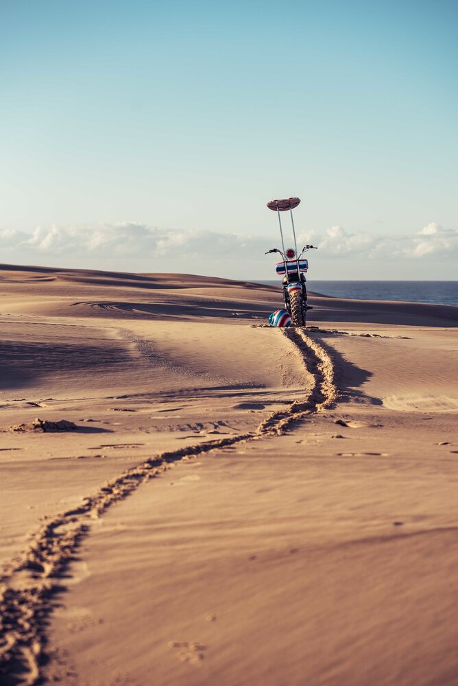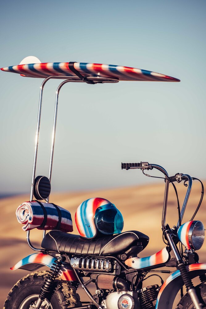 Biraz gürültülü bir motor da olsa yumuşak ve konforlu bir sürüş imkanı sunan heybetli selesi ve serbest uzanan egzozuyla Goof Bike’ın kesinlikle bir tarzı var. Sörf rafı gören metal parça ise herhalde bu motosikleti en özel kılan şey. Bu raf sayesinde, gölgesine sığınabileceğiniz bir alan da yaratmış oluyor. Metal rafın üzerinde plaj havlusu için de özel bir yer ayrılmış.