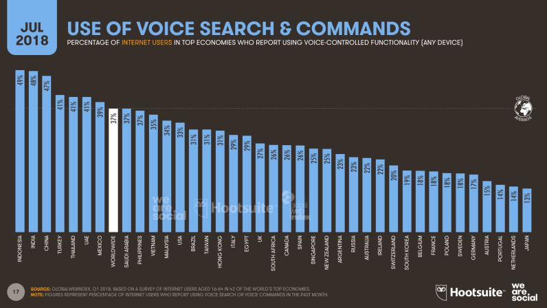 Yine GlobalWebIndex’e göre özellikle Asya’da sesli komut ve sesli aramada ciddi bir artış gözleniyor. Özellikle dünyadaki internet kullanımının yarısını kaplayan Çin ve Hindistan’da bu iki özellik giderek yaygınlaşıyor. 16 ile 24 yaş arasındaki dünyadaki internet kullanıcılarının yüzde 45’i geçtiğimiz ay ses arayüzlerini kullandığı ve 55 ile 64 yaş arasındakilerin de sadece yüzde 17’sinin kullandığı görülüyor.