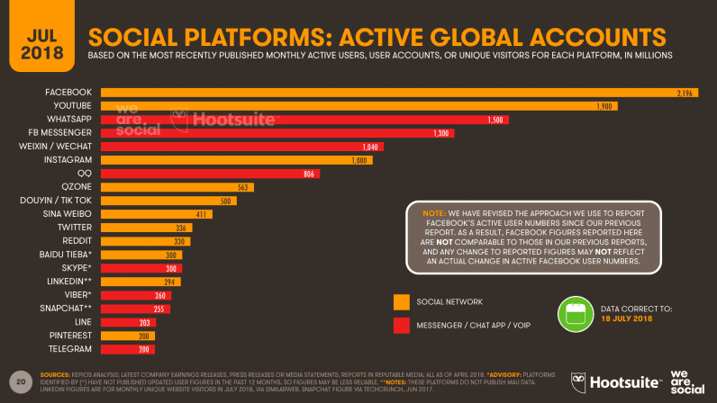 Her ne kadar Facebook güvenimizi sarsmış olsa da son zamanlardaki adının karıştığı davalarla, yine de geçen çeyreklerdeki birincilik bayrağını elinde tutmaya devam ediyor. Bu çeyrekteki raporda da 2,196 milyar aktif kullanıcının olduğu gözlemleniyor. Geçtiğimiz çeyreğe göre 67 milyon kullanıcı kaybeden şirket için çok da üzülemiyorum çünkü dünya da her gün 151,600 kişi ortalamasıyla ölüm gerçekleşiyor. Zaten bu günlük ortalamanın bir yılda getirisi de 55 küsur milyon oluyor.