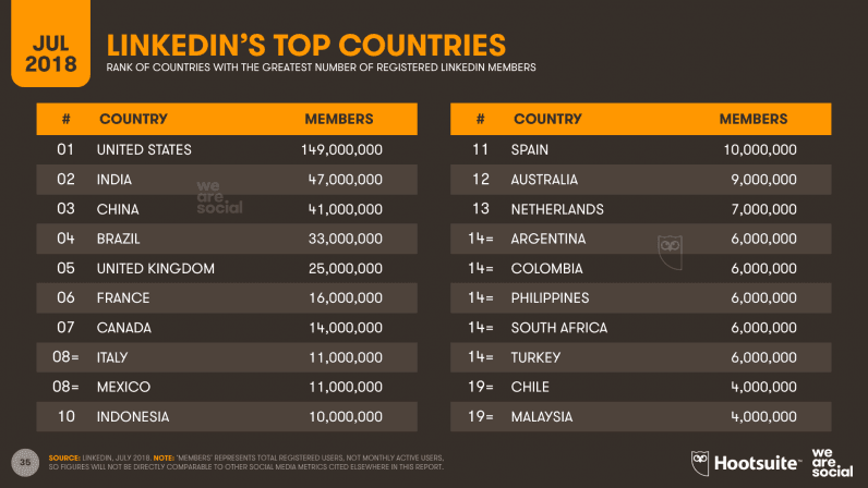 LinkedIn’de ise durumlar iyi. SimilarWeb’in verilerine göre her ay neredeyse 300 milyon insanın uğradığı bir yer artık bu mecra. LinkedIn’in kendi açıklamalarına göre kullanıcıların yüzde 70 ABD dışından ve Hindistan sıralamada ikincilikte. Özellikle de LinkedIn’in Çin’de izin verilen tek ve büyük batılı sosyal platform oluşuna da dikkat eder ve Çin2in nüfusunu da hatırlarsak, bu ülkede kayıtlı 41 milyon LinkedIn kullanıcısı olması belki ülke için küçük ama işverenler için büyük bir pazar olabilir.