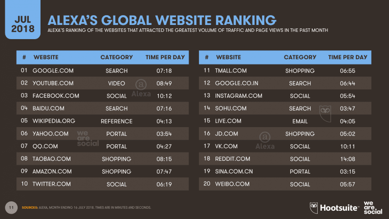 Alexa’ya göre Taobao ve Amazon siteleri ikinci çeyrekteki liste sıralamasına göre yükseldi. İki site de Twitter’ın önüne geçerek ilk 10’a girmeyi başardı. Geçtiğimiz çeyrekte 6. sırada olan Reddit’se 18. sıraya geriledi. SimilarWeb’in de sıralamalarında bu çeyrekte değişiklik gözlemleniyor ama. YouTube Facebook’un ikinciliğini bu sene elde ediyor ve Google birinci YouTube ikinci elele ilk üçte gözlemleniyor. Facebook kardeşlerinden Instagram ise web-dostu atılımlarıyla 6. sırada görülüyor.