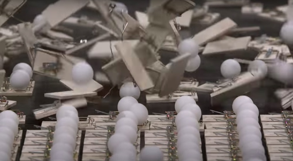 Fare kapanlarına yerleştirilmiş masa tenisi toplarının bulunduğu düzenek ilk olarak sosyal mesafe kuralına uyulmadan dip dibe diziliyor. Virüs taşıyıcısı olarak düşünebileceğimiz bir top yukardan bırakılıyor. Temas ettiği topun kapanı harekete geçtiği anda sıralı bir şekilde diğerleri de kapanmaya başlıyor. Ancak kapanlar belirli bir aralıkla dizildiğinde virüs taşıyıcısı olarak gördüğümüz top kimseye çarpıyor. Ohio Sağlık Departmanı’nın #InThisTogetherOhio etiketi ile sosyal medyalarında paylaştığı bu video yayılımı durdurmak için ne yapmamız gerektiğini açık bir şekilde gösteriyor.