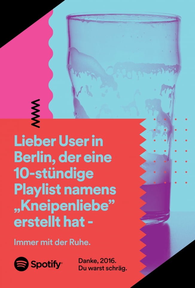 Spotify Yönetim Kurulu Başkanı Seth Farbman, bu kampanyanın 2015’de yaptıkları seneye müzikal anlamda bir bakış sunan kampanyadan esinlendiğini söylüyor. Oradaki verinin farklı coğrafi bölgeler temel alınarak incelenmesinin ilginç sonuçlar doğuracağının fark edilmesiyle dinleyici davranışı ile kültür arasındaki ilişkiyi vurgulayan bu kampanya ortaya çıkmış. Teknolojiyi ve büyük veriyi insanlaştırmanın mizahi bir yolunu sunan çalışmanın sloganı: “Thanks 2016! Its been weird!” (Teşekkürler 2016! Tuhaf bir yıl oldu!)