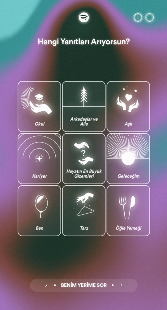 Spotify Şarkı Falı; okul, arkadaşlar ve aile, kariyer, hayatın en büyük gizemleri, geleceğim, ben, tarz, aşk ve öğle yemeği başlıklı kategorilerle açılıyor. Kategoriyi seçtikten sonra sorunuzu yazmaya başlıyorsunuz. Ancak tamamen kendi kurduğunuz bir soru cümlesi giremiyorsunuz. Bunun yerine, sizinkine benzer soru önerilerinden seçim yapıyorsunuz.