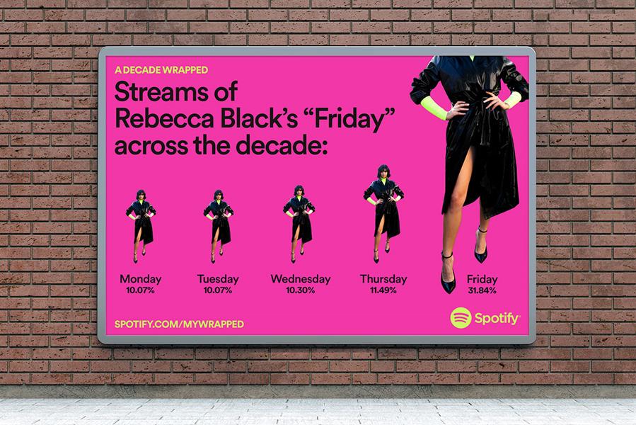 Spotify, Decade Wrapped ile kullanıcılarına son on yılda ilham veren, gülümseten, hayatlarını değiştiren anları hatırlatarak birçok yönden son on yılın özetini çıkarıyor. New York’taki Penn İstasyonu, Westfield London alışveriş merkezi, São Paulo’nun ulaşım ağlarındaki sık kullanılan noktalar gibi önemli merkezlerinin yanı sıra 9 Alman şehrinde, Birleşik Krallık’ta ve Japonya’da Mariah Carey, Lil Nas X, BTS ve J. Balvin gibi sanatçıların dinlenme verileri yer alıyor. Açık hava kampanyaları istatistiki verileri ve meme’ler ile yıl sonuna kadar yer alacak.