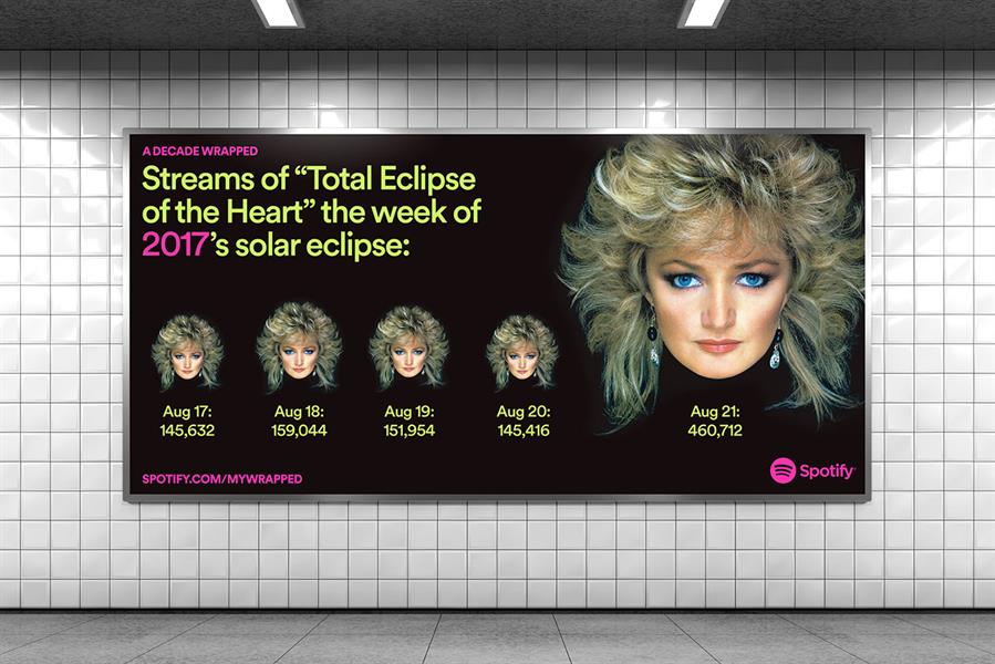 Spotify her sene sonunda olduğu gibi kullanıcı verisini kullanarak bir açık hava kampanyası hazırladı. Almanya’dan Brezilya’ya kadar pek çok ülkede yayına giren kampanya son on yılın istatistikleriyle kullanıcı alışkanlıklarını, akış trendlerini eğlenceli açık hava reklamları ile duyuruyor. 2017 yılının sonunda yaratılan 2018 Goals isimli kampanya kullanıcıların Spotify’daki seçimlerini inceleyerek bunları yeni yıl kararlarına dönüştürmüştü. 2016 yılındaki kampanya ise o senenin verilerine mizah yüklü bir bakış atıyordu.