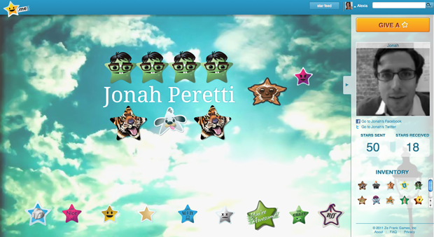 Ze Frank üç yıl önce tanıttığı siteyi herkesin sevilmek ve onaylanmak gibi temel bir ihtiyacı olduğundan yola çıkarak kimlik manifestosunun diğerlerinin vasıtasıyla yansıtılmasını sağlayan bir araç olarak konumlandırmıştı. O zamanlar siteye dahil olmak için davet almak gerekiyordu, sonrasında istediğiniz kadar kişiyi davet edebiliyordunuz. Aşağıdaki görsel Buzzfeed kurucu ortağı ve CEO’su Jonah Peretti’nin o dönemdeki Star.me profili.