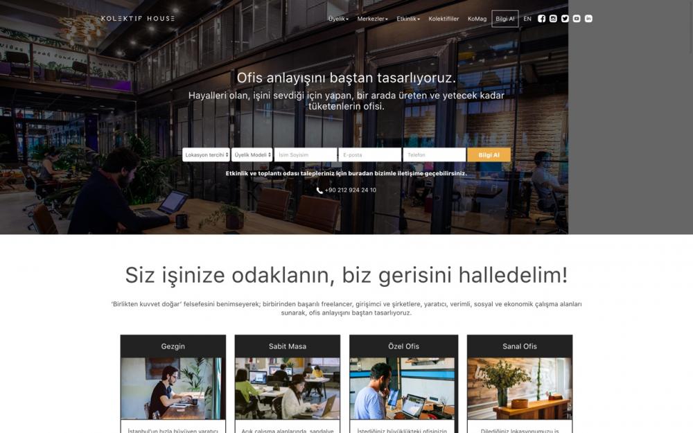 Levent, Şişhane ve Sanayi Mahallesi olmak üzere 3 noktada hizmet veren Kolektif House, “Birlikte kuvvet doğar!” diyerek kendi ekosistemini yaratıyor. Çeşitli etkinliklerle üyeler arasındaki iletişimi güçlendiren ve bağlantı kuran Kolektif House gezgin, sabit masa, özel ofis ve sanal ofis modelleriyle hizmet veriyor.