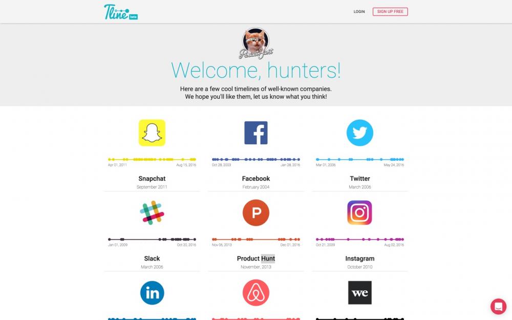 Farklı konular üzerine zaman tünelleri hazırlamayı sağlayan Tline, Product Hunt için hazırladığı sayfada 9 girişimin gelişimindeki önemli noktaları basındaki yansımlarıyla arşivliyor. Hazırlanan derlemede Snapchat, Facebook, Twitter, Slack, Product Hunt, Instagram, LinkedIn, Airbnb ve WeWork yer alıyor ve medyadaki ilk yansımalarından günümüzdeki büyük haberlerine kadar uzanıyor.
