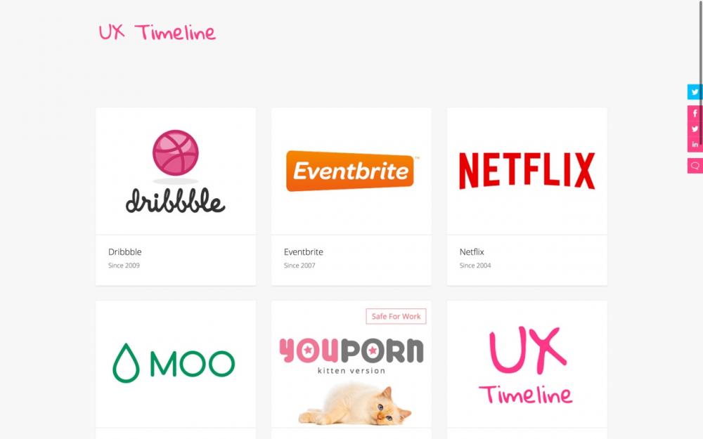 15 girişimin ilk günden bugüne değişimine odaklanan UX Timeline, internet sitelerinin değişimine kullanıcı deneyimi perspektifinden yaklaşıyor ve yıldan yıla tasarım değişikliklerini listeliyor. UX Timeline’ın bu portfolyosu Dribble, Eventbrite, Netflix, Moo, YouPorn, UX Timeline, Product Hunt, Shazam, Mailchimp, Vimeo, Dropbox, Spotify, Uber, Airbnb, Deezer’dan oluşuyor.