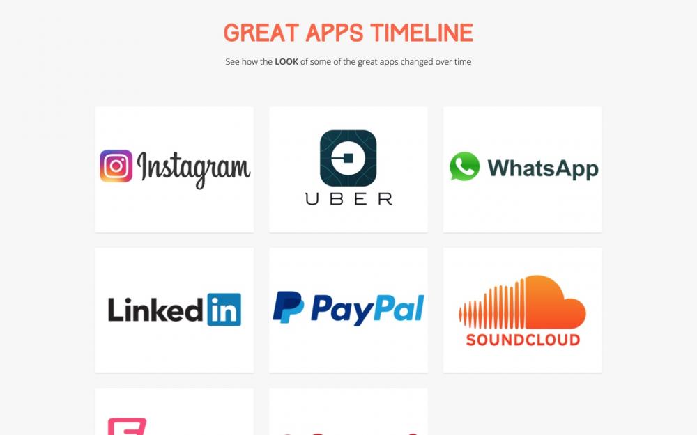 Mobil cihazlarda popüler 8 girişimin arayüz tasarımlarını ele alan Great Apps Timeline, uygulama arayüzlerinin 2010’dan günümüze değişimlerini ekran görüntüleriyle aktarıyor. İnternet sitesinde listelenen girişimler ise; Instagram, Uber, WhatsApp, LinkedIn, Paypal, Soundcloud, Foursquare ve Pinterest.