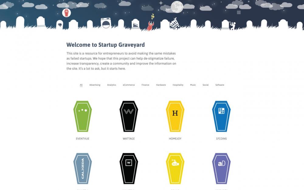 Girişimcilerin geçmişte yapılan hataları tekrarlanmaması için hazırlanan Startup Graveyard, çeşitli sebeplerle başarısız olmuş 28 girişimin hatalarına odaklanıyor. Şeffaf bir topluluk ve bilgiyle iyileştirilen bir ekosistem için kurulan Startup Graveyard, başarısız girişimleri sektörel listeleme opsiyonu da sunuyor.