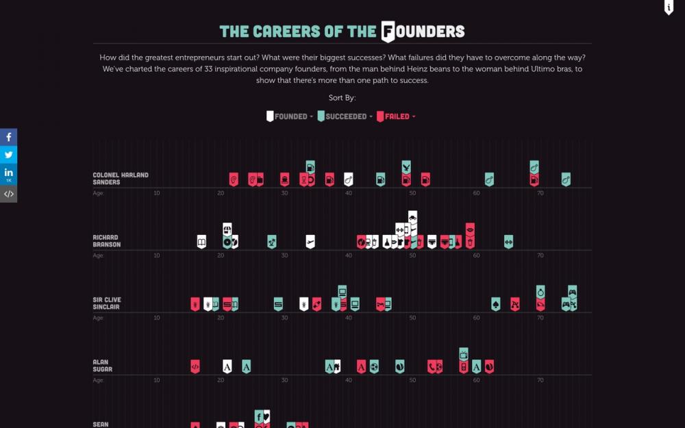 Kitleler tarafından tanınmış 33 girişimcinin yaşamına odaklanan The Careers of the Founders, ele aldığı girişimcilerin yaşamları boyunca kurduğu şirketleri, başarısızlıkları ve başarıları zaman çizgisi üzerinde gösteriyor. Walt Disney’den KFC’nin kurucusu Albay Harland Sanders’a, Steve Jobs’dan Henry Ford’a, Arianna Huffington’dan Daniel Ek’e uzanan geniş bir yelpazede farklı sektörlerden girişimciler listede yer alıyor.