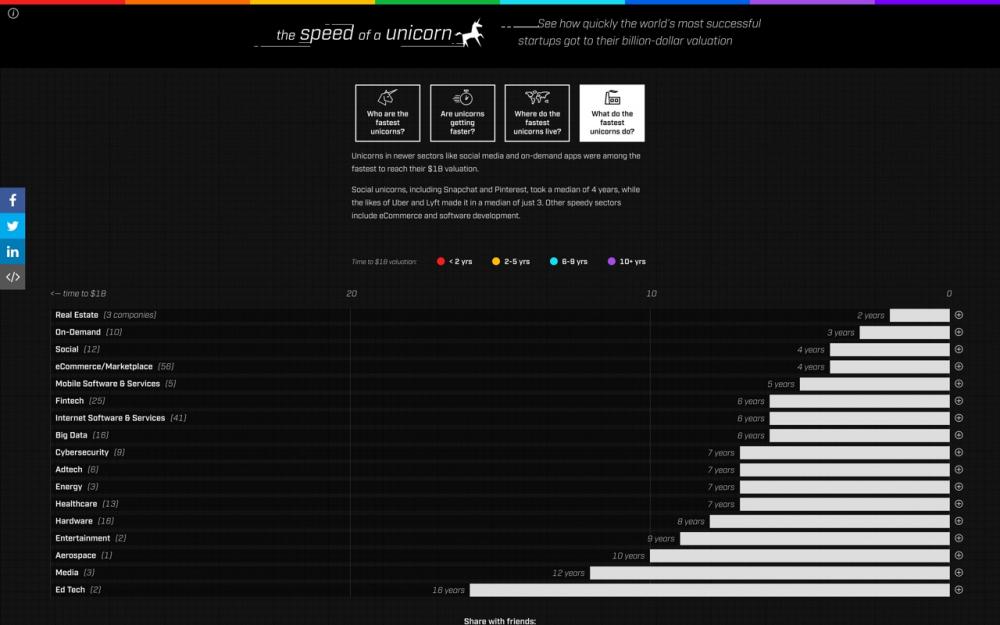 Girişimlerin Unicorn olma süreçlerini inceleyen The Speed of a Unicorn, şirketlerin milyar dolar değere ne kadar sürede kavuştuğu inceleyen interaktif bir site. Dünya çapında 223 şirketi ele alan The Speed of a Unicorn, bu şirketleri 4 farklı parametrede ele alıyor. Bunlar; kuruldukları yıla göre kaç yılda 1 milyara ulaştılar, kurulduktan sonra kaç yılda Unicorn olduklar, en hızlı Unicorn olanlar hangi kıtadan ve Unicorn’lar hangi sektörlerde faaliyet gösteriyor?