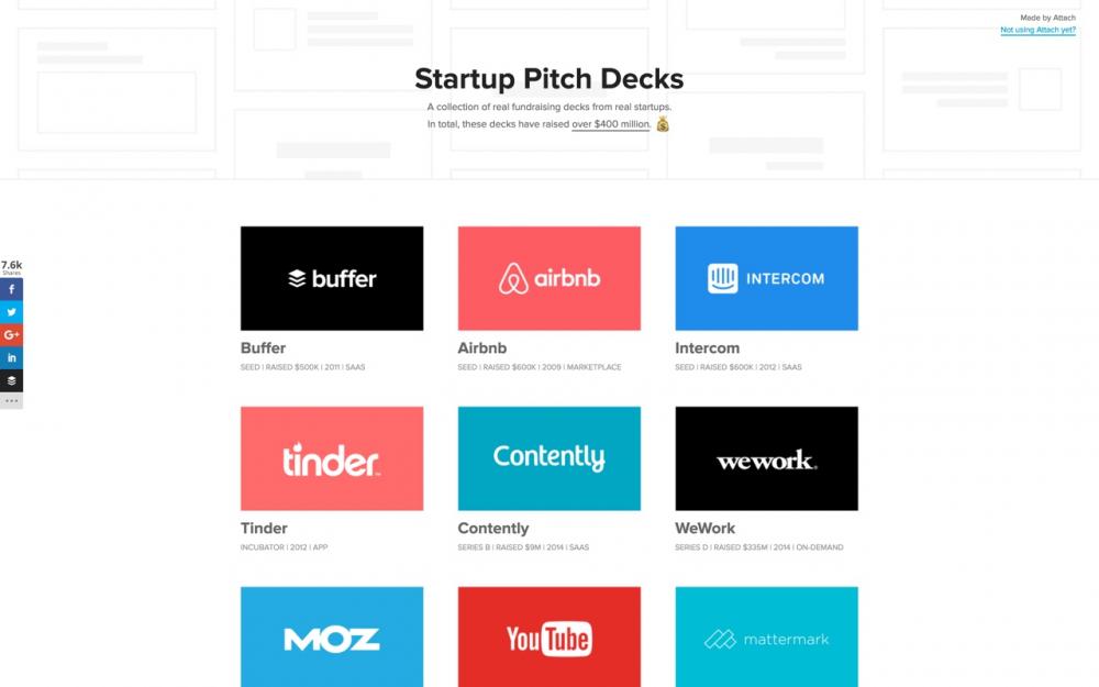 19 girişimin yatırımcılara hazırladığı sunum dosyasını listeleyen Startup Pitch Decks, girişimlerin erken döneminde karşılaştığı fonlamaların ilk adımlarını aktarıyor. Airbnb, Buffer, Tinder, YouTube, BuzzFeed, FourSquare gibi şirketlerin sunumlarının yanı sıra kurucularının yorumları ve kaynak bağlantılar da sitede yer alıyor. Şirketlerin şeffaflığını da cesaretlendiren Startup Pitch Decks’in listelediği girişimler toplamda 400 milyon dolardan fazla yatırım aldı.