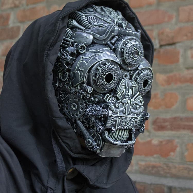 Dmitriy Bragin’in maskeleri, yüzün tamamını metalik görünümlü bir yapıyla kaplıyor. Bu maskeleri incelediğinizde; küçük dişliler, yaylar, somunlar, mercekler ve daha nice teknik unsuru fark ediyorsunuz.