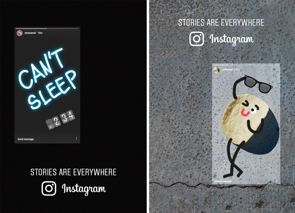 Instagram’ın başka uygulamalardan kopyaladığı (PHHHOTO’yu hatırlar mısınız?) veya zaman içinde geliştirdiği Boomerang, çizim fırçaları, canlı yayın, emoji gibi özellikleri kullanarak ünlü filmlerden, popüler kültürden farklı ikonları Instagram Stories’de baştan yaratan içerikler gösteriliyor. Bir uzay mekiğinin kalkışından SüngerBob’un sabun yutup duş almasına kadar binbir farklı sahnenin Stories’de kendine yer bulması işleniyor. Hazırlanan açıkhava afişleri de normal dünyadaki sıradan bir karenin Instagram Stories çerçevesiyle nasıl renklendiğini ve bir tutam eğlence katıldığını sergiliyor. Tüm bunlara ek olarak da marka ve ajans birlikte Almanya’nın Köln kentinde Insta Stories Festival isimli bir festival düzenleyerek Instagram’ın Stories ile yarattığı dünyaya katılımcıları ortak edilmiş ve Stories’le çekilmiş birçok kısa filmin gösterimi yapılmış.