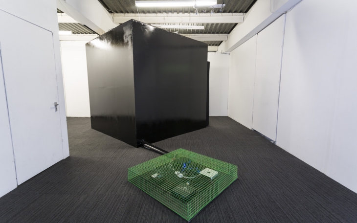 Marios Athanasiou fiziksel alanda maddenin katı, tek zamanda tek yerde olabilme durumuna karşı kuantum fiziğinin varlığını hatırlatarak sanal alanda da benzer bir dinamiğin görüldüğünü yeşil, morötesi reaktif sıvı dolu akrilik su deposu ile siyah küpten oluşan yerleştirmesiyle temsil ediyor. Yerleştirme su sensörleri, hoparlör, Max MSP, javascript, WebGL, node.js ve express.js kullanımıyla hazırlanmış.