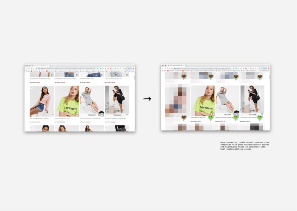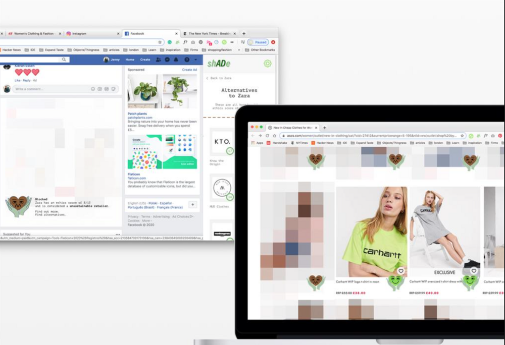Imperial College London ve Royal College of Art öğrencilerinin ortaklaşa geliştirdiği shADe adlı eklenti, internet üzerinden yapılan alışverişlerde etik olmayan hızlı moda markalarını engelleyerek hem şirketleri hem de tüketiciyi sorumluluk sahibi olmaya teşvik ediyor.
