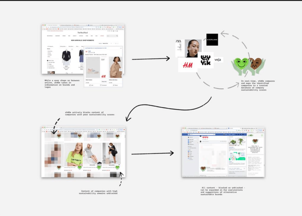 shADe, bir kullanıcı internette gezinirken gerçek zamanlı olarak markaları ve logoları tanımak için makine öğrenmeyi kullanıyor. Güvenilir şirketlerin sürdürülebilirlik puanlarının bulunduğu bir veri tabanıyla sürekli karşılaştırma yaparak çalışıyor. Sürdürülebilirlik puanları düşük olan şirketlerin reklamlarını engelliyor.