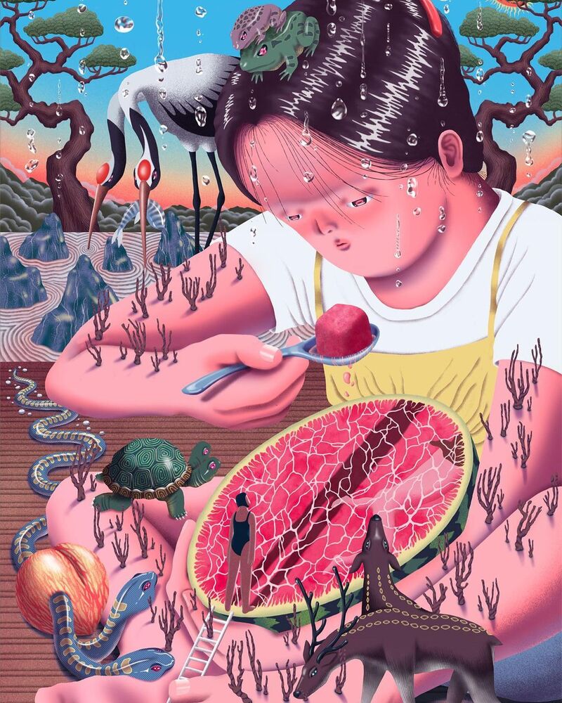 Dani Choi, Güney Kore’de doğan ve şu anda Brooklyn, New York City’de yaşayan kendi deyimiyle sadece zevk için çizim yapan bir illüstratör. Gerçek dışı işleriyle bilinen ve aynı zamanda resimli çocuk kitapları da hazırlayan Dani, eserlerinde dünyadan yabancılaşma, ayrılık ve bireysellik duygularını ön plana çıkarıyor. Canlı renklere sahip tuhaf karakterlerle bezeli kompozisyonlarında birden çok katman bulunuyor ve her katmanda farklı bir hikayeyi yakalamak, bakış açısına göre farklı anlamlar çıkarmak mümkün oluyor.