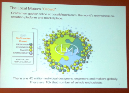 Bu arada Jay önemli bir tanımlama düzeltmesi de yaptı; eskiden crowdsourcing yani kitle kaynak yöntemli denilen araç geliştirme süreçlerini artık co-creation ile yani imece yaratımdiyerek tanımlıyorlar. Bu yaratım sürecinde katkıda bulunan tasarımcılar, hem geliştirdikleri ve üründe kullanılacak tasarımlar için ödüller kazanabiliyorlar, hem de kimi geliştirmeler için telif hakkının da sahibi oluyor ve satılan araç başına bir ödeme alabiliyorlar. Jay’e göre imece araç geliştiren kitle için asıl önemlisi, isimlerinin gerçek bir modelin açıklamasına yazılmış olması. Bunun en büyük motivasyo olduğunu söylüyor Jay. Özellikle 2008 krizinden sonra otomotiv sektöründe çok ciddi sayıda kalifiye elemanın işinden olduğunu, bunların Local Motors projelerinde hünerlerini sergilemek için can attığını da ekliyor.