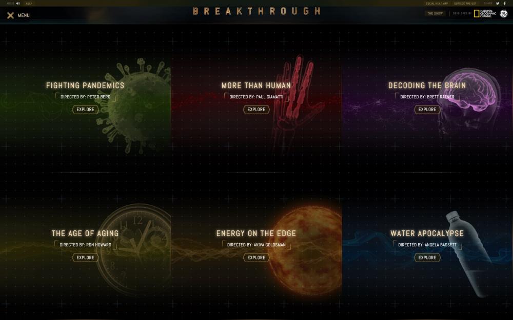 Neo-Pangea tarafından West Reading’de geliştirilen Breakthrough, National Geographic ve General Electric işbirliğiyle hazırlanan internet sitesi, bilim ve teknoloji dünyasındaki çığır açan gelişmeleri kolay bir dille anlatıyor. Su, beyin, uzay, insan, yaşlanma gibi insanlığın büyük gizemleri üzerine makaleler yer alıyor.